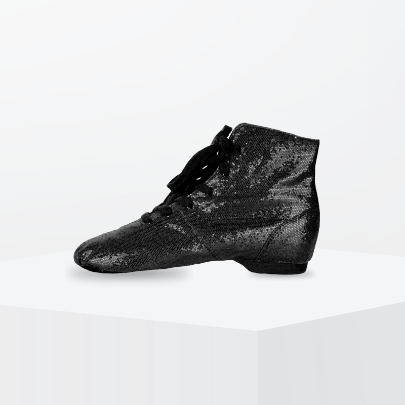 Jazz-Stiefel aus glitzerndem Canvas mit Schnürsenkeln. Ausgezeichnete Knöchelunterstützung. Sohle und Absatz aus Wildleder für müheloses Drehen und Gleiten Perfekt für Shows für Junioren.