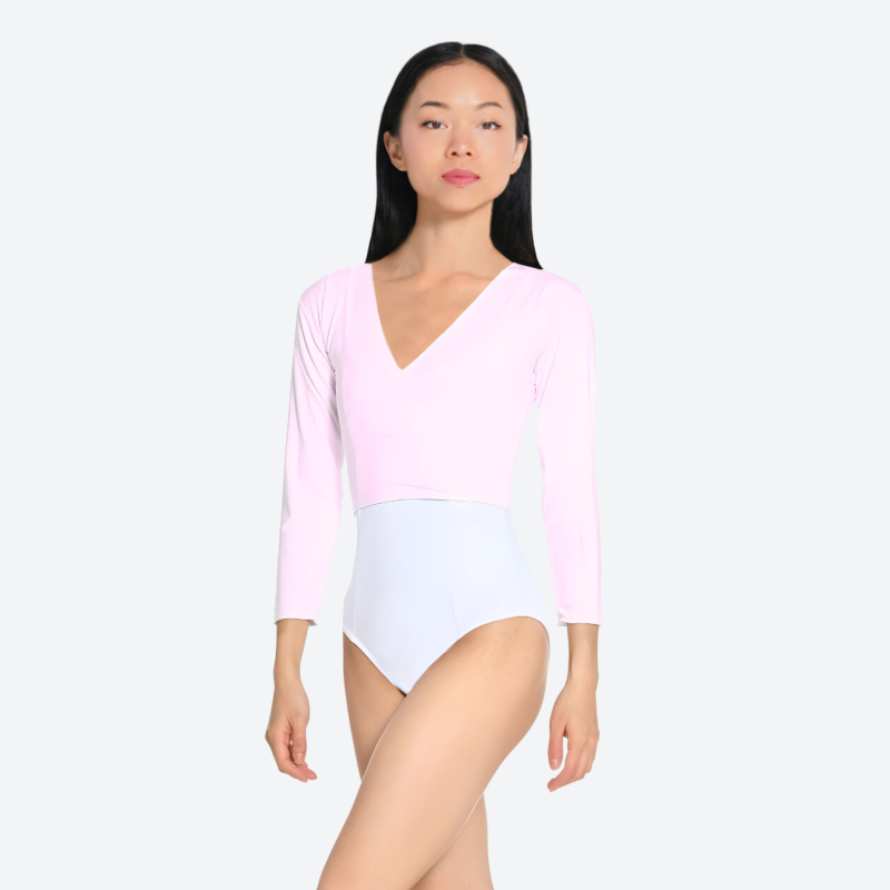 Cache-cœur à manches longues en tissu extensible. À porter sur vos justaucorps et tuniques.
